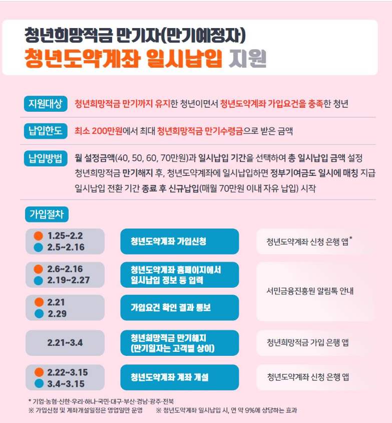 [청년도약계좌 일시납입 안내]청년희망적금 만기*까지 유지한 청년이면서 청년도약계좌 가입요건을 충족한 청년이 청년도약계좌에 원활하게 연계 가입할 수 있도록 청년희망적금 만기수령금을 청년도약계좌 가입시점에 일시에 납입할 수 있도록 지원함